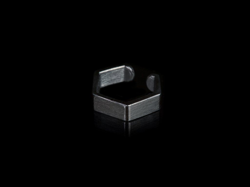 Ručně vyrobený ear cuff ve tvaru šestiúhelníku v patinovaném stříbře.