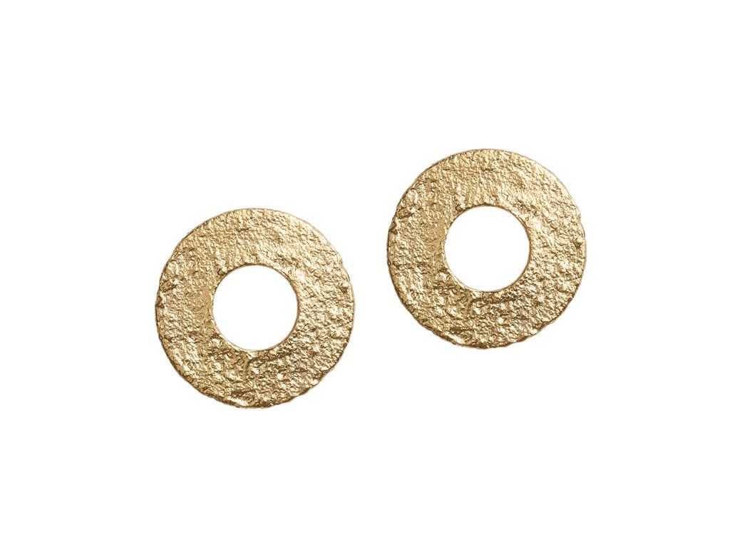 Ručně vyráběné náušnice vznikají otiskem struktury rzi do ušlechtilého materiálu. Povrchová úprava zlacením a hladký geometrický tvar mezikruží zjemňují jinak drsný vzhled šperku.