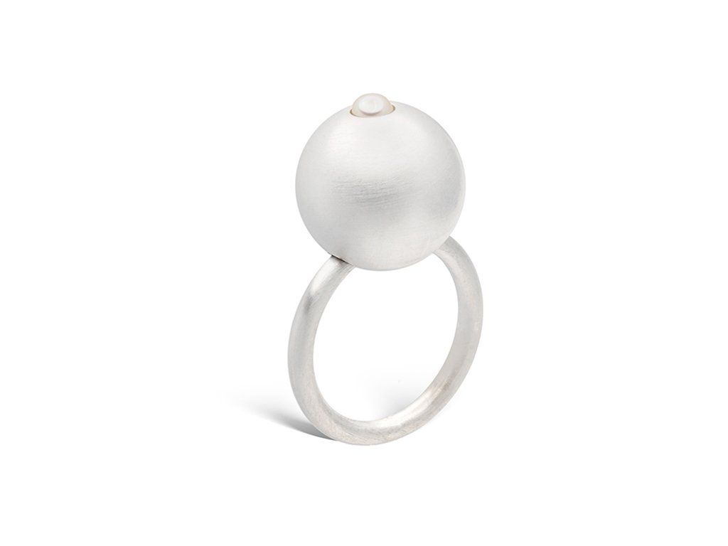Díky většímu průměru kuličky se ze šperku stává nápadný a originální objekt, který si zaslouží vlastní prostor při speciálních příležitostech. Jedinečnosti mu přidává sametová něha bílé říční perly vsazené do stříbrného pouzdra.